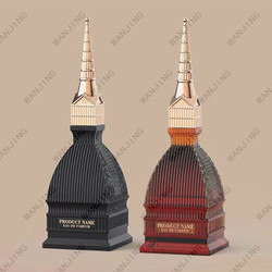 75ml Forma de Torre Zamac Cap Perfume Botella de vidrio Estampado en caliente Bomba de superficie Pulverizador Sello FEA Embalaje de fragancia vacía